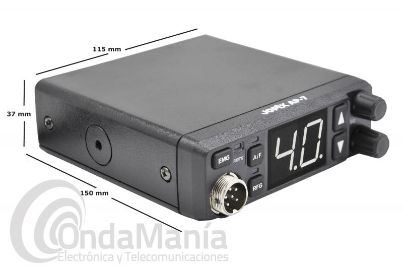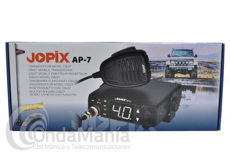 La Jopix AP-7 es una emisora de banda ciudadana CB-27 de uso sin licencia, con antena magnética Jetfon MAG-7 incluida con un tamaño compacto, la emisora es muy compacta con un display retroiluminado de 40 canales, squelch automático ASQ y alimentación de 12V/24V con conector de encendedor .