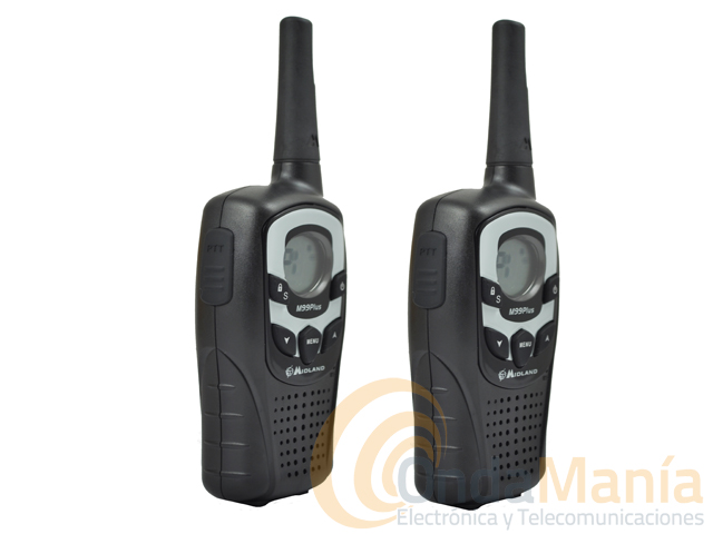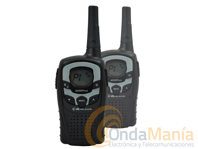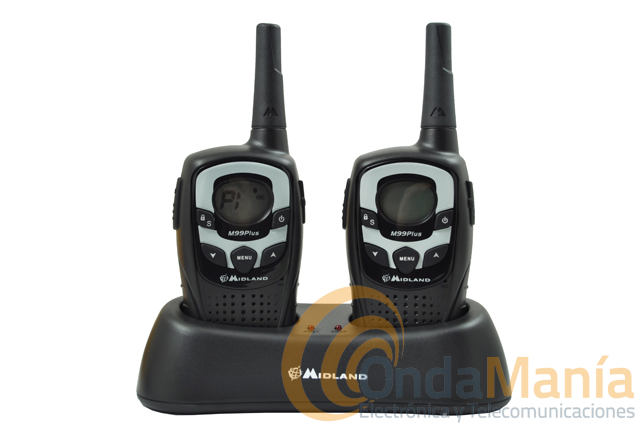Pareja de PMR Midland M99 Plus con 99 canales "Comunicación libre sin coste adicional" incluyen baterías recargables, cargador doble de sobremesa, dos fundas, dos microfono auriculares (pinganillos) con posibilidad de VOX o PTT, timbre de llamada, roger beep, CTCSS,....