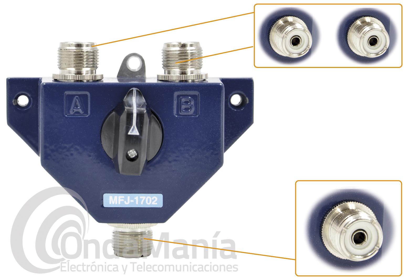 Conmutador de antena de alta calidad con dos entradas y una salida, con conectores tipo PL, dispone de posición central, diseñado para conectar 2 antenas a 1 transmisor, su rango de frecuencia es de 0 a 450 MHz y su potencia máxima es de 2500 W P.E.P.