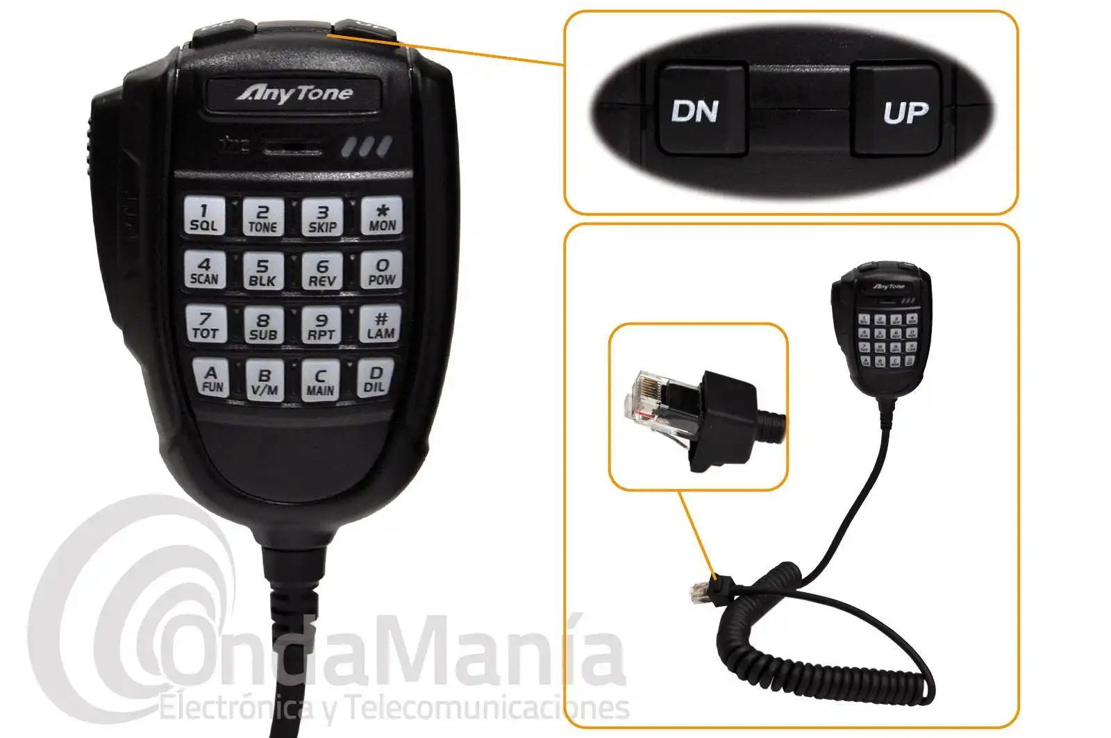 Micrófono original de recambio original para la emisora doble banda Anytone AT-779UV con pulsador PTT, teclado y conector tipo RJ45.