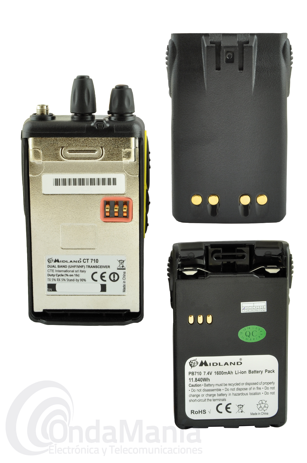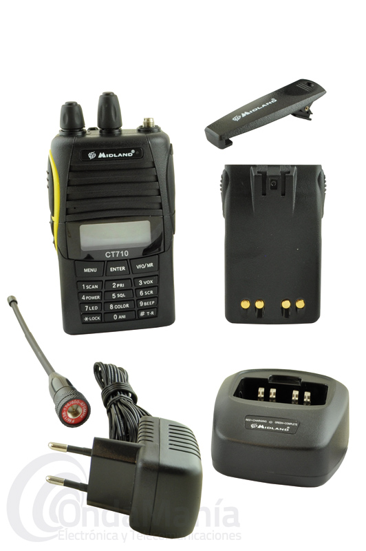 Contenido: transceptor Midland CT-710, Antena, Pack de baterías de Li-Ion de 1600 mAh, Clip de cinturón, Cargador de sobremesa rápido con adaptador de corriente y guia rápida en castellano (manual de instrucciones en castellano disponible en pdf)