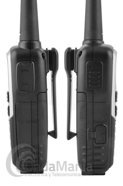 El pack incluye: 2 Midland XT-50, 2 baterías recargables, 2 clips de cinturón, 1 base (bañera) de carga, cable USB de carga, manual de instrucciones.