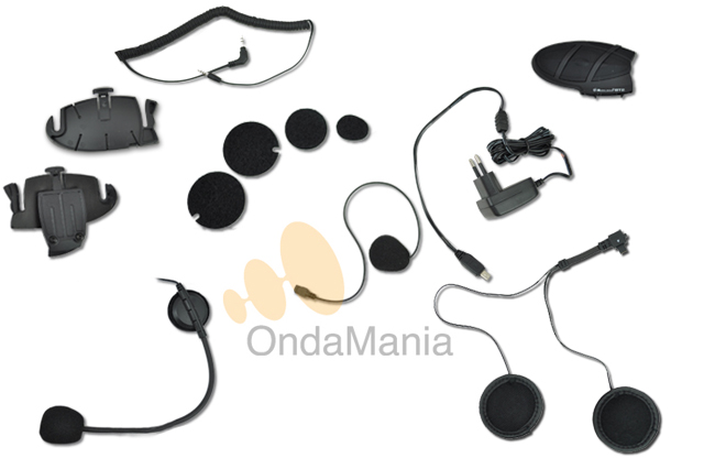 2 BT2, 2 kits audio con altavoces estéreo, 2 micrófonos varilla regulable y de hilo, 2 cables estéreo para iPOD/MP3, cargador de pared de doble carga, 2 kit de fijación para montaje bi-adhesivo y de mordaza.