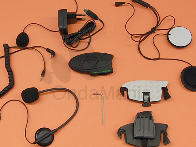 DOBLE SISTEMA DE FIJACIÓN AL CASCO: con mordaza o base con adhesivo. DOS TIPOS DIFERENTES DE MICRÓFONO: de varilla regulable y de hilo CARGADOR unitario de 220 V.