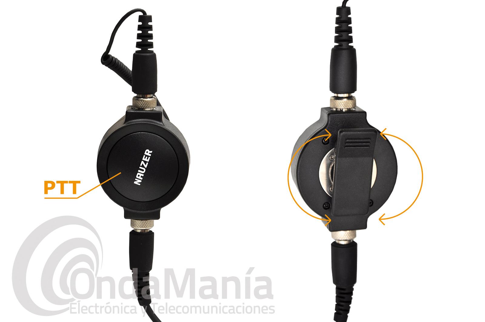 El micro-auricular PTT (botón para pulsar y hablar) manejable, dotado de una capsula de micrófono de alta calidad. Cables reforzados para asegurar una mayor durabilidad. La pinza de sujeción para solapa y otra pinza en el PTT su sistema de fijación le permite una rotación de 360º. Soporte de oreja engomado blando.