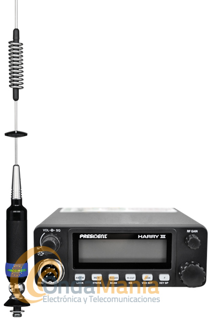 Pack compuesto por una emisora de 27 Mhz banda ciudadana President Harry III ASC 12/24 V, podemos conectarla a 12 v o a 24 v directamente en nuestro vehículo y una antena President Washington.