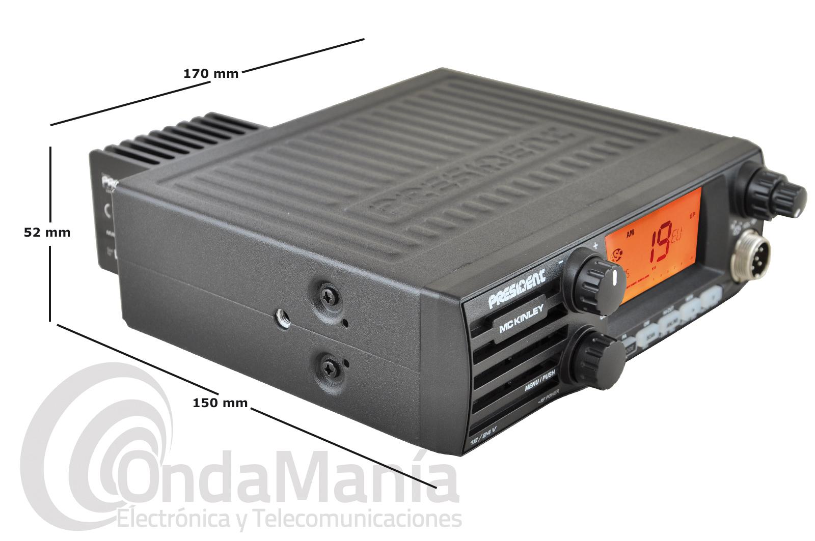 Emisora de banda ciudadana CB-27 Mhz President Mc Kinley bi-tensón 12 / 24 V, formato DIN, dispone de AM, FM y Banda Lateral BLU, Roger Beep, Bip sonoro de teclas conmutable, RF power, gran pantalla LCD multifunción con visualización de canal y frecuencia, clarificador, 3 memorias, filtros anti-parasitos ANL, NB, HI-CUT, ajuste de ROE mediante bips sonoros, altavoz frontal, compatible con micrófonos electret o dinámico, escáner de canales y memorias, Eco, Ajuste de contraste, ajuste de tono, 2 canales prioritarios,....