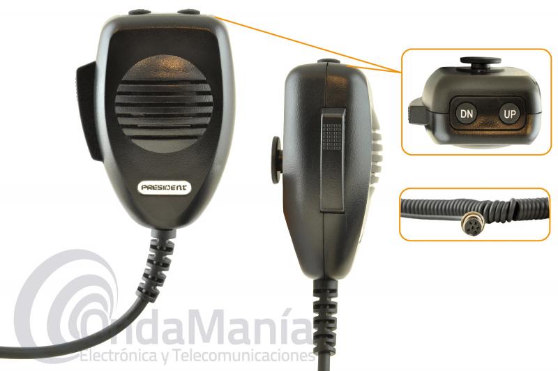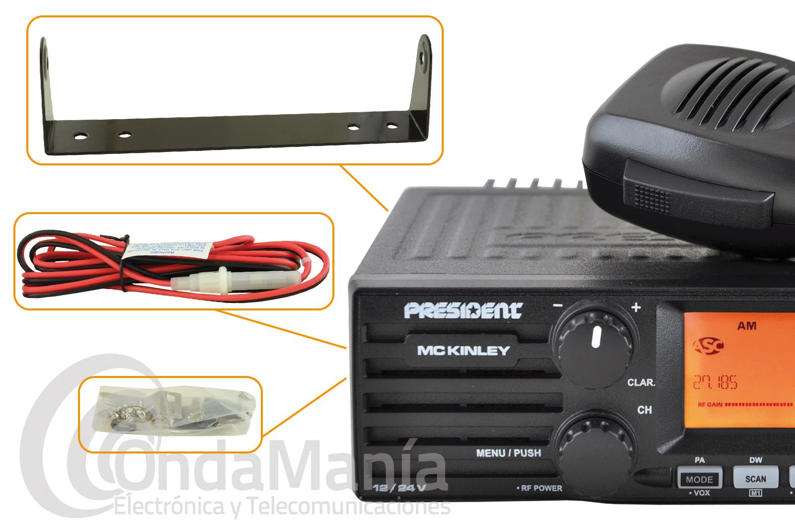 Accesorios suministrados: 1 emisora President Mc Kinley, 1 micrófono UP/DOWN, 1 soporte de montaje con tornillos, 1 soporte de micrófono, 1 cable de alimentación con fusible y manual de instrucciones en castellano.