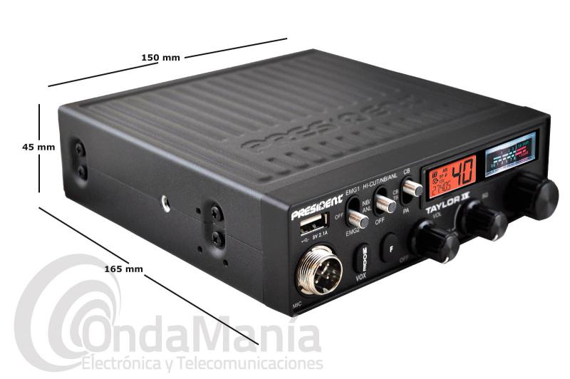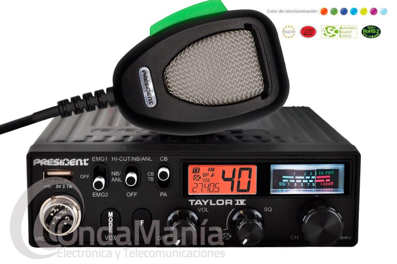 Emisora de banda ciudadana CB-27 President Taylor IV DM ASC, nueva versión de la mítica President Taylor con un atractivo diseño y grandes novedades como una gran pantalla LCD multifunción, indicador de frecuencia, Roger Beep, Talkback, filtos ANL, NB, HI-CUT, beep de teclas conmutable, escáner, VOX, medidor de ROE y potencia, toma USB, preselección de canal de emergencia, public Address,... Esta nueva versión incluye el micrófono President Digimike con NCR (Noise Reduction Circuit), esta diseñado para que su modulación sea lo más clara posible en todos los modos (AM/FM/SSB), eliminando el ruido de fondo. Dispone de 5 niveles de filtrado ..
