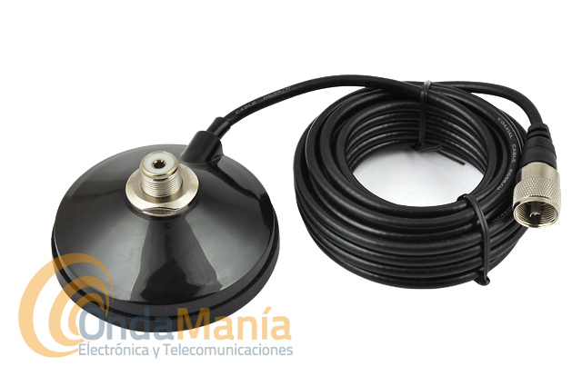 Base magnética metálica plateada con conector PL y con un diámetro de 7,6 cm.