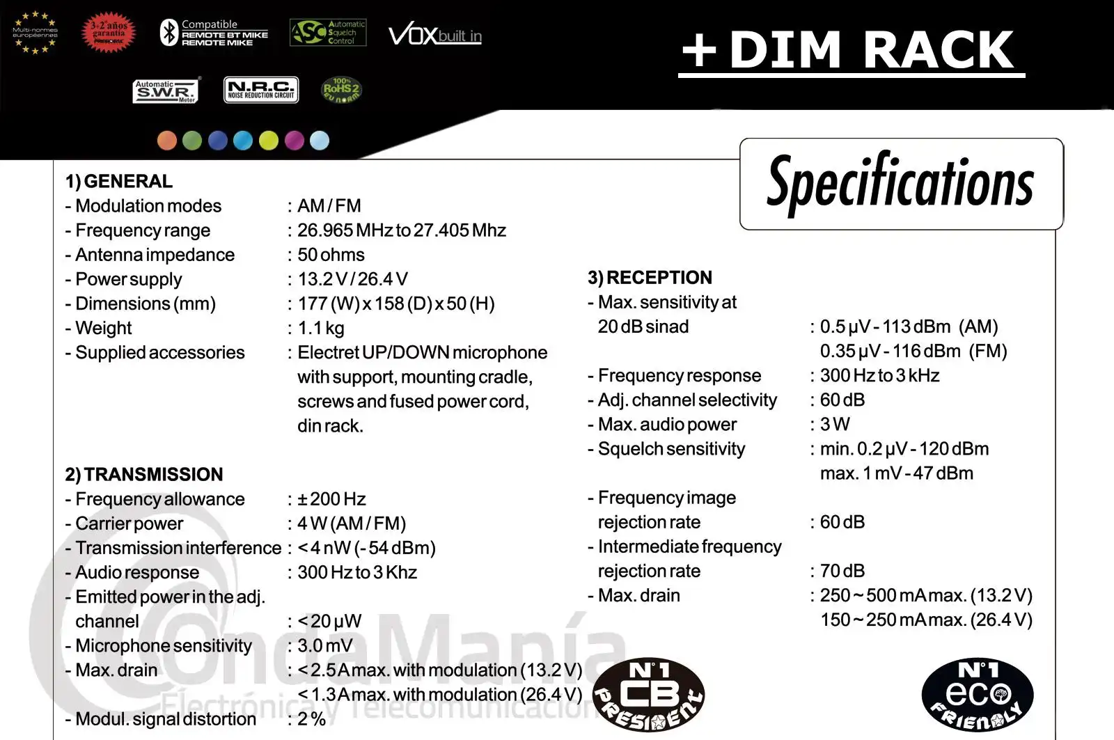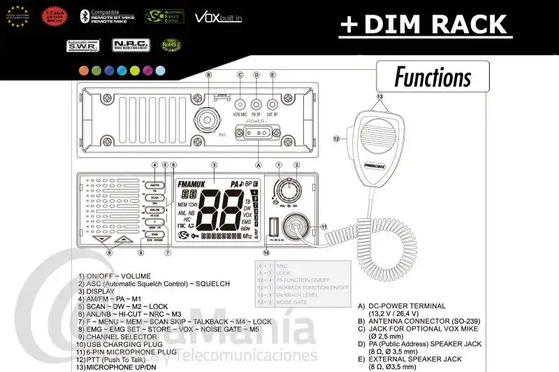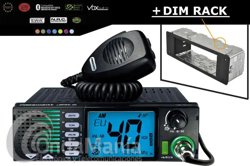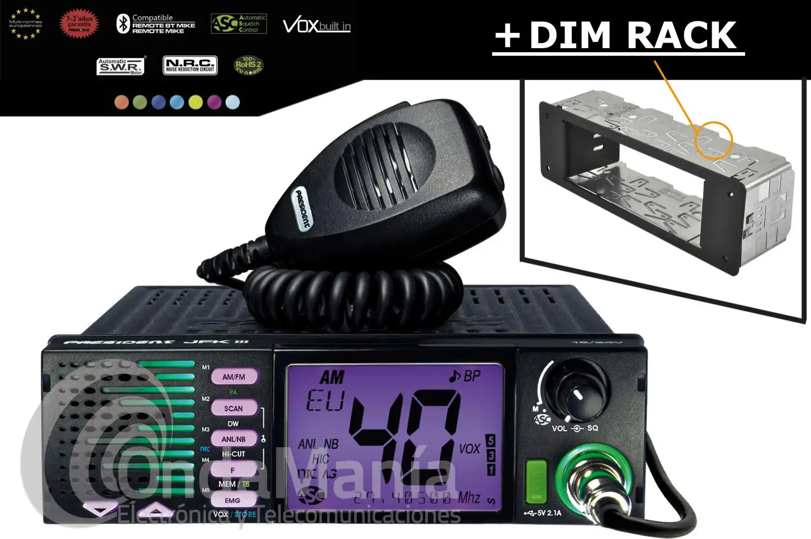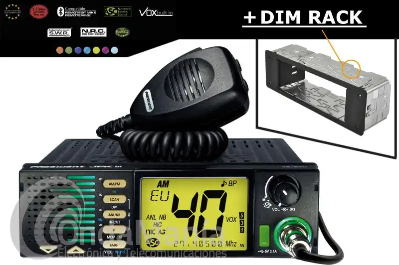 Emisora de banda ciudadana CB-27 President JFK III multi norma Europea con AM Y FM y entrada de 12/24v, con 7 colores de display seleccionables, incluye soporte DIN para instalación en huecos de auto-radios, squelch automático ASC, medidor de ROE automático, filtro NRC Noise Reduction Circuit, función Scan Skip, memorización de 5 canales, compatible con los micrófonos manos libres Remote BT Mike y Remote Mike,...
