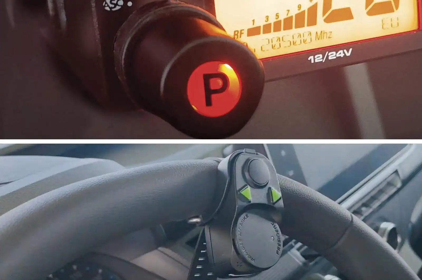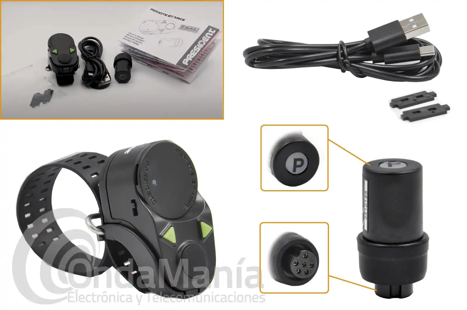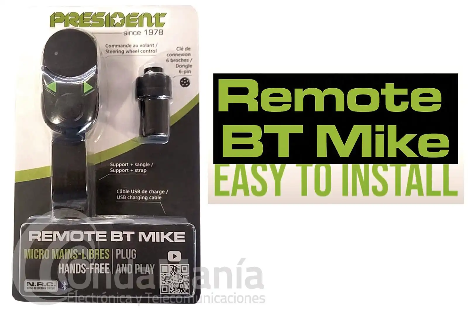 Micrófono President manos libres inalámbrico Bluetooth compuesto por un dongle o llave electrónica con conector de 6 pins conmutado para emisoras President y un mando de control de fácil instalación para el sujetarlo en el volante, este mando nos permite controlar la emisora sin cables: subir y bajar canales y poner el equipo en TX y RX, el micrófono incluye un filtro NRC, batería recargable y un cable de carga con toma USB. Compatible con emisoras President con conector de micrófono de 6 pins.