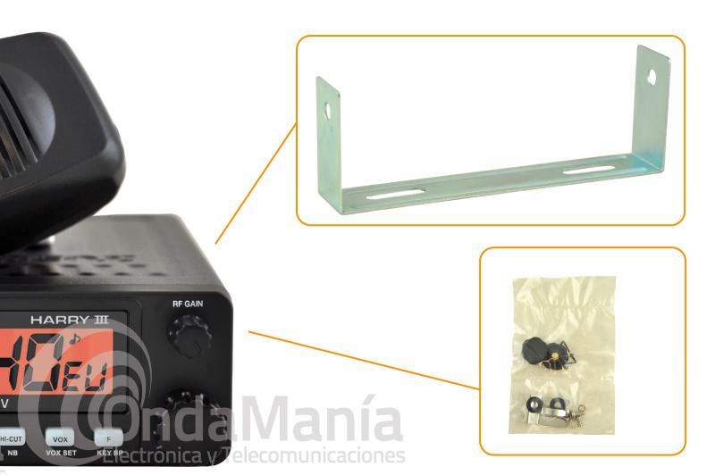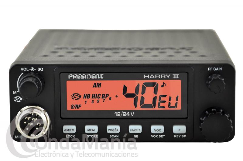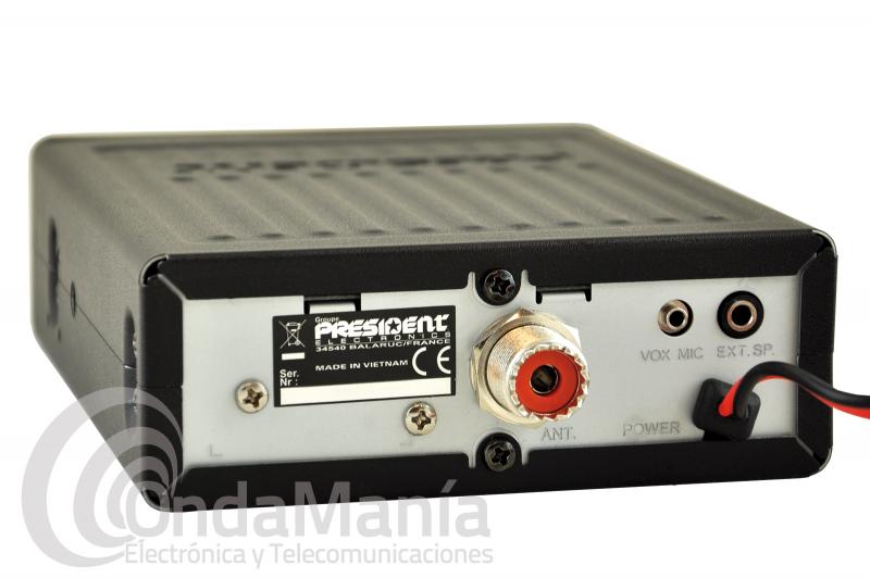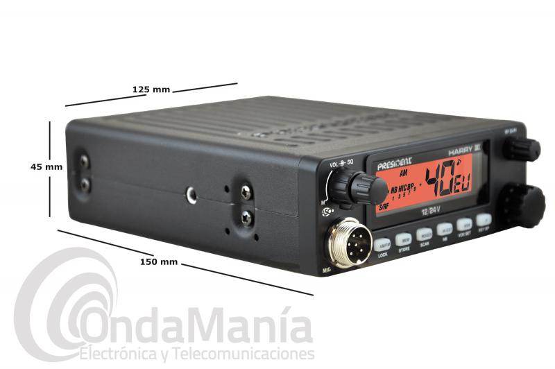 Transceptor de 40 canales AM/FM (multi normas europeas). Selector de canales, ajuste de volumen con interruptor encendido apagado, incluye ASC (squelch automatico) y squelch manual, ganancia de RF, visualizador de TX por medio de led, display del canal en uso, indicador de nivel, S-meter con led, conmutador de modo, y filtro anti parásitos ANL integrado, toma trasera para altavoz exterior. Dimensiones: 125x45x150 (ancho/alto/profundo) (dimensiones sin el conector de antena). Podemos conectarla indistintamente a 12 VCC o a 24 VCC