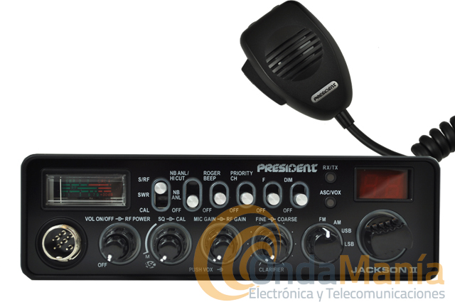 President Jackson II ASC transceptor AM/FM/USB/LSB de banda ciudadana (27 Mhz) con multi-normas Europeas. Dispone de medidor de ROE, subida/bajada de canales desde el micrófono, squelch manual y automático, roger beep, filtros, un robusto paso final de RF; el cual proporciona una gran calidad de transmisión,... y dos grandes ventajas sobre su antecesor el President Jackson ASC como es la toma frontal de micrófono y su tamaño más reducido.