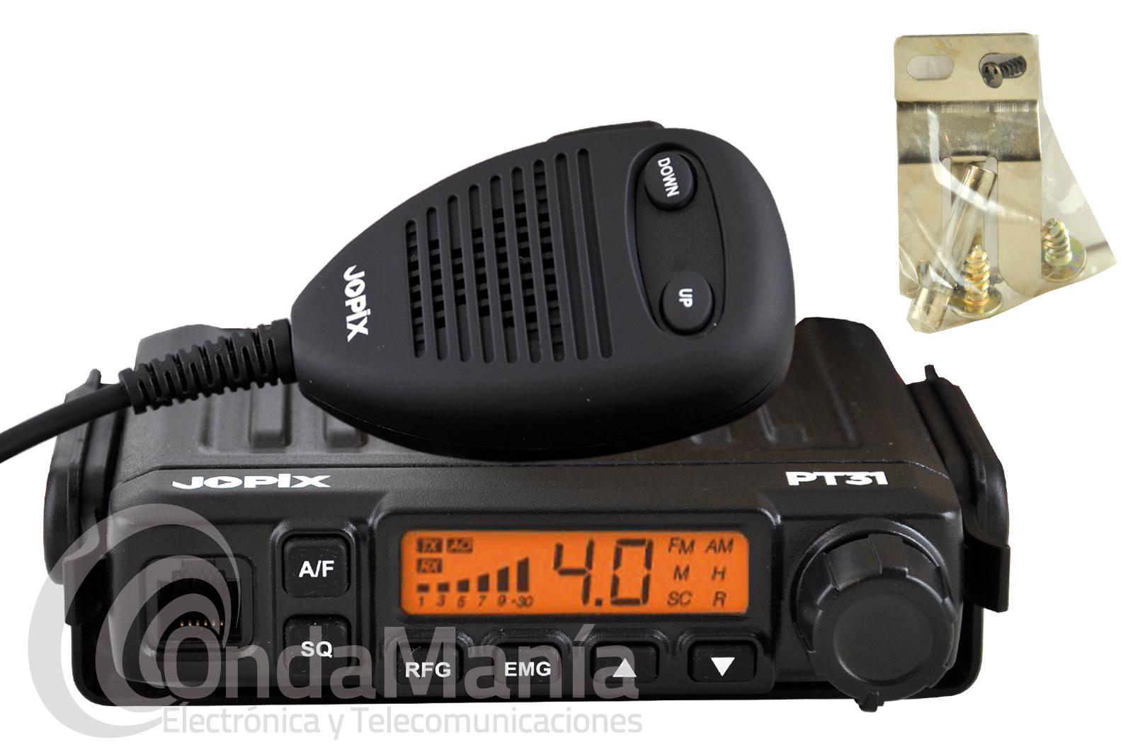 Emisora de 27 Mhz CB banda ciudadana Jopix PT-31 multinorma con AM y FM, dispone de un display LCD multifuncion con smeter, escáner, subida y bajada de canales desde el micrófono, micrófono con conector RJ, squelch manual y automático,...