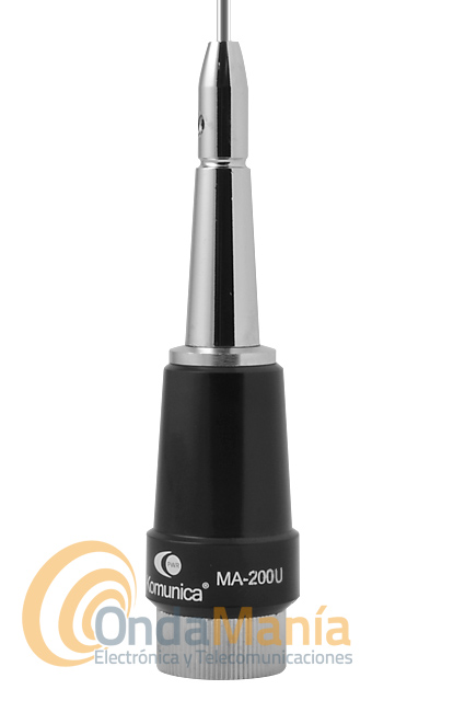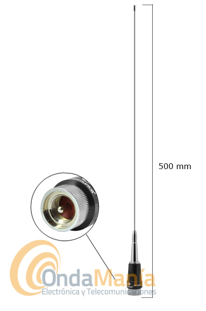 Antena para móvil de UHF ajustable de 400 a 480 Mhz con 3,5 dB de ganancia, medio metro de longitud y 140 gramos de peso.