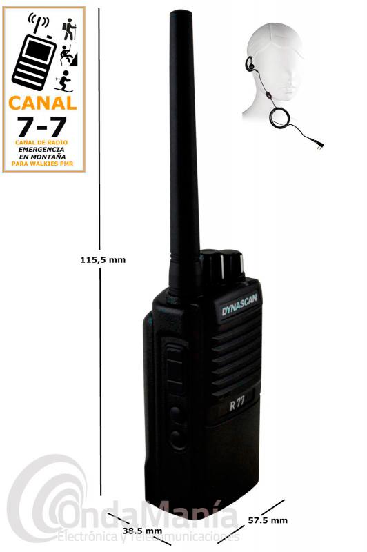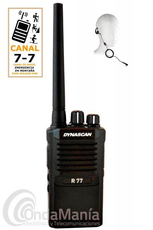 El Dynascan R-77 versión ESPECIAL MONTAÑA es un walky PMR-446 de uso libre recomendado para su uso en senderismo, escalada, skitravesia, BTT, barranquismo, geocachig o cualquier actividad relacionada en el monte, montaña,... incluye el canal de radio utilizado en montaña 7 - 7 con el que vas a poder coordinarte dentro de un grupo. En el canal 7 - 7 podemos recibir o solicitar ayuda de otros montañeros, recibir o emitir información del entorno, comunicarte con grupos de rescate,....con 16 canales, sin licencias, sin tasas, compacto, robusto y fiable, incluye batería de litio de alta capacidad con 7,4 V y 1600 mAh, cargador rápido y pinganillo de regalo.
