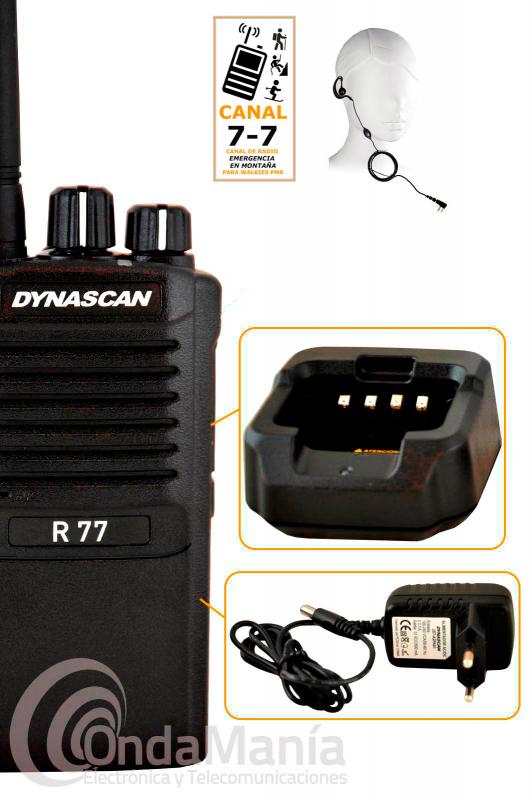 El pack incluye: Dynascan R-77, batería de alta capacidad de litio con 1600 mAh, clip de cinturón, cargador rápido, correa de mano, pinganillo y manual de instrucciones en castellano.