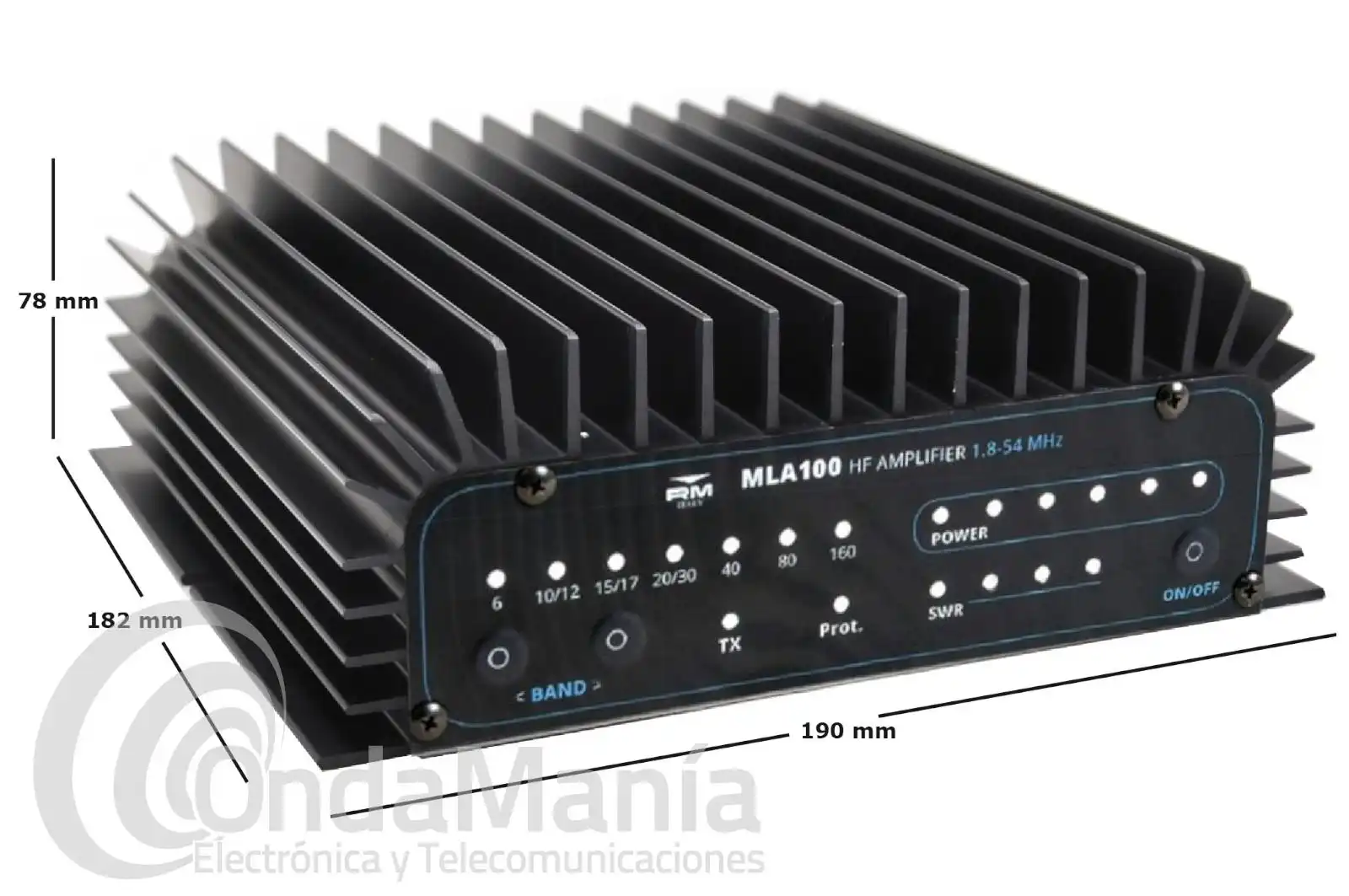 El RM MLA-100 es un amplificador de 100 W y 12 V perfectamente adecuado para radios QRP con una potencia de transmisión de 5 W. Con una potencia de entrada de de 1 a 10 W, el amplificador alcanza una potencia de salida de 100 W aprox. en las bandas de 160 a 10 m, y con una excitación de 8W, una salida de 80 W aprox. en las bandas de 6m.
