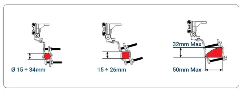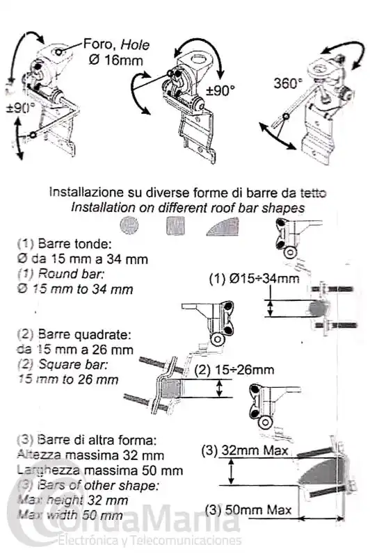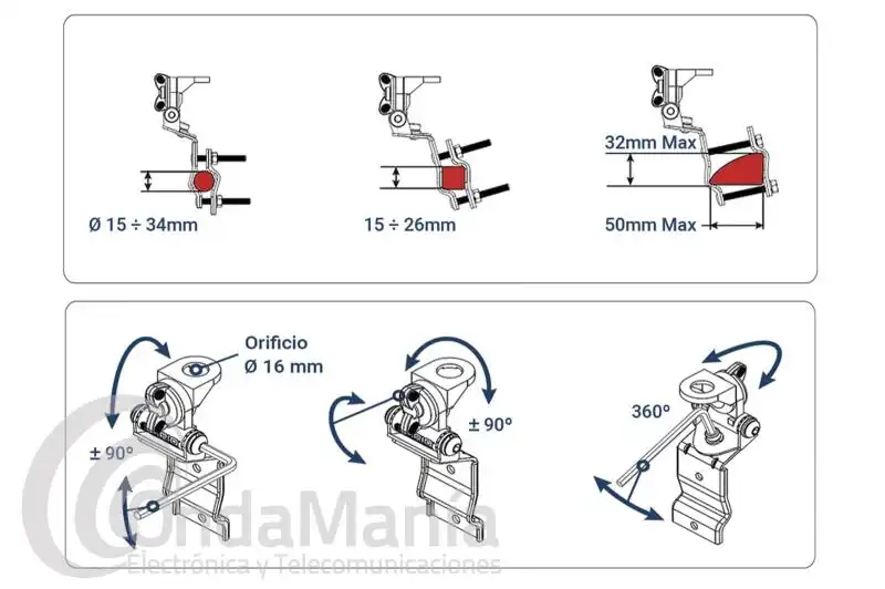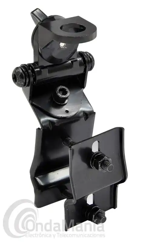 Soporte universal de antena, tubular. Se adapta a barras o barandillas de diferentes formas y tamaños. Sus articulaciones permiten ajustar la inclinación sobre 3 ejes. Orificio de montaje para la base Ø 16 mm