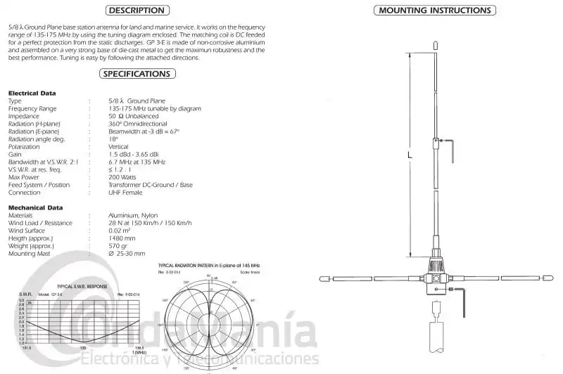 SIRIO GP-3E ANTENA DE BASE VHF DE 5/8 AJUSTABLE DE 135 A 175 MHZ