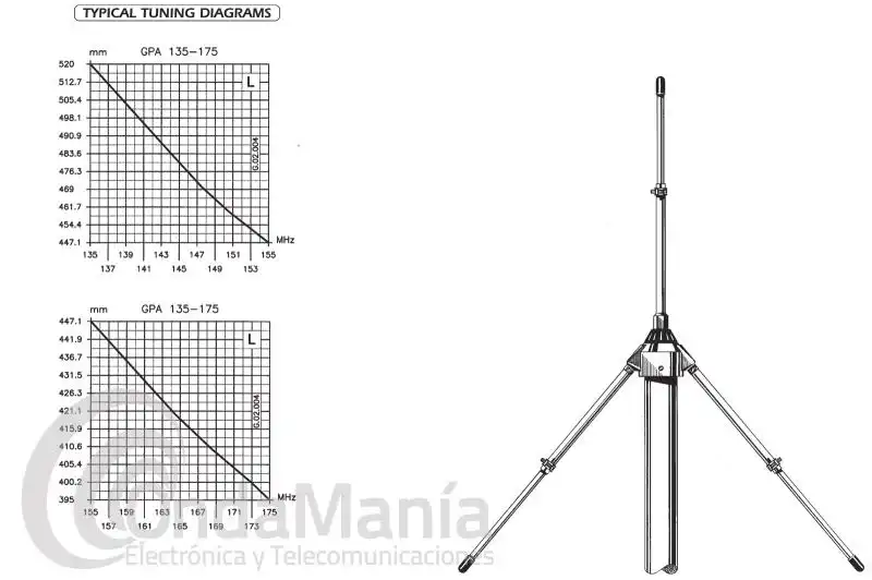 Antena Sirio GPA 135 - 175 base omnidireccional tipo ground plane de 1/4 de onda., ajustable entre 135 y 175 MHz con un ancho de banda 13 MHz, con conector PL-Hembra en la base (SO239), tiene una ganancia 2.15 dBi, 0dB y una potencia máxima de 300 W.