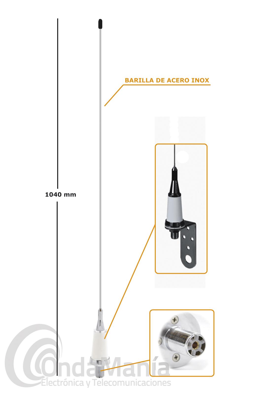 Antena Sirio náutica SB-2S INOX de VHF 1/2 onda. Con elemento radiante - varilla (flexible) en acero inoxidable de alta calidad. Longuitud 1m. Se suministra con soporte M1 de acero inoxidable. Conector SO239 en la base.