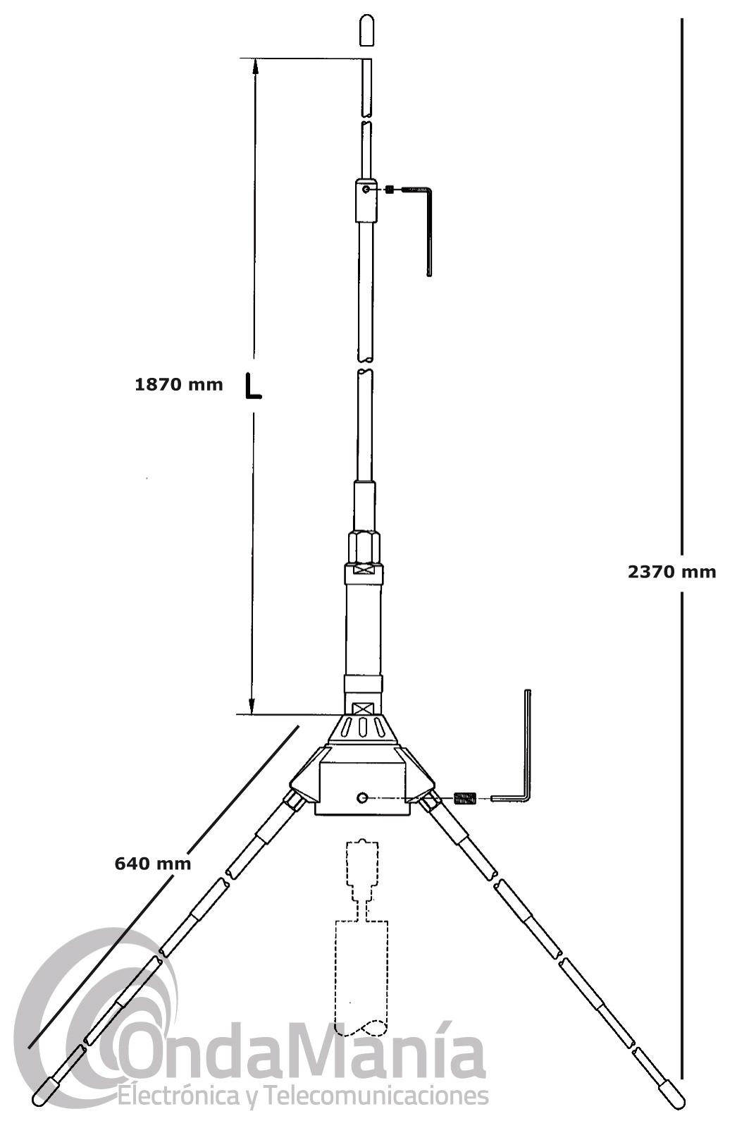 Antena de base para banda ciudadana CB-27 de 1/4 de onda, omnidireccional, fabricada en aluminio, con un rango de frecuencia de 26 a 28 Mhz, con una longitud de 2,37 cm y unos radiales de 64 cm aprox., potencia máxima en AM y FM de 100 W y 300 W en SSB.