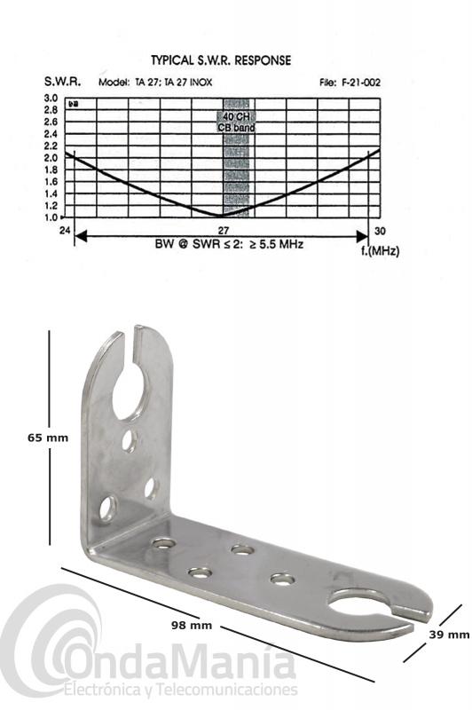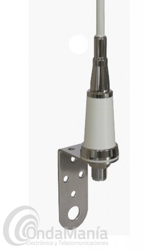 Antena náutica de banda ciuddana CB-27 & 10 mts, para instalación en mástil, tiene un conector PL hembra (SO239) en la base, no precisa plano de tierra, el radiante esta encapsulado en fibra, su potencia máxima es de 50 W.