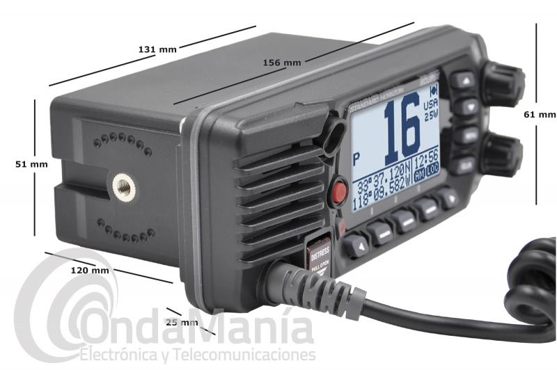 Emisora marina de VHF, clase D, con GPS y DCS clase D incluidos, dispone de una potencia de 25 W, gran pantalla LCD, fácil de instalar, sumergible 1,5 metros durante 30 minutos IPX8, el micrófono dispone de cancelación de ruido, cambio de canal y botón de acceso directo al canal 16/S y cambio de potencia alta/baja,....