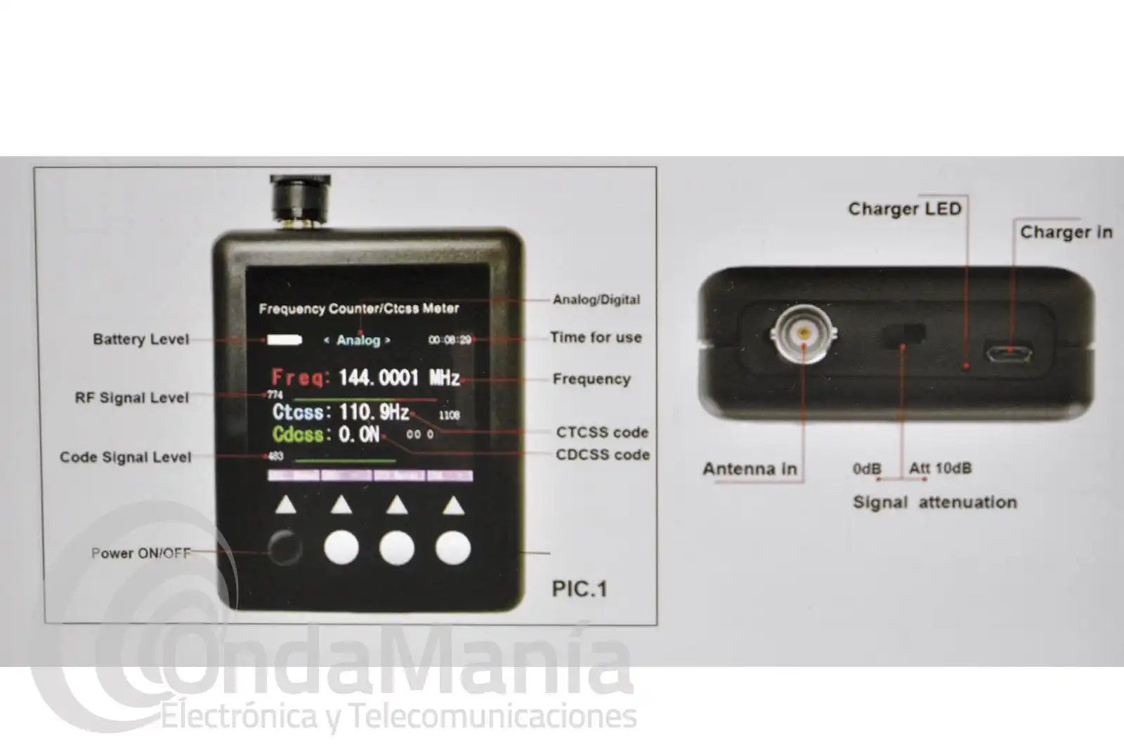 rango de frecuencia de 27 Mhz a 3 Ghz, decodifica tonos CTCSS y DCS,