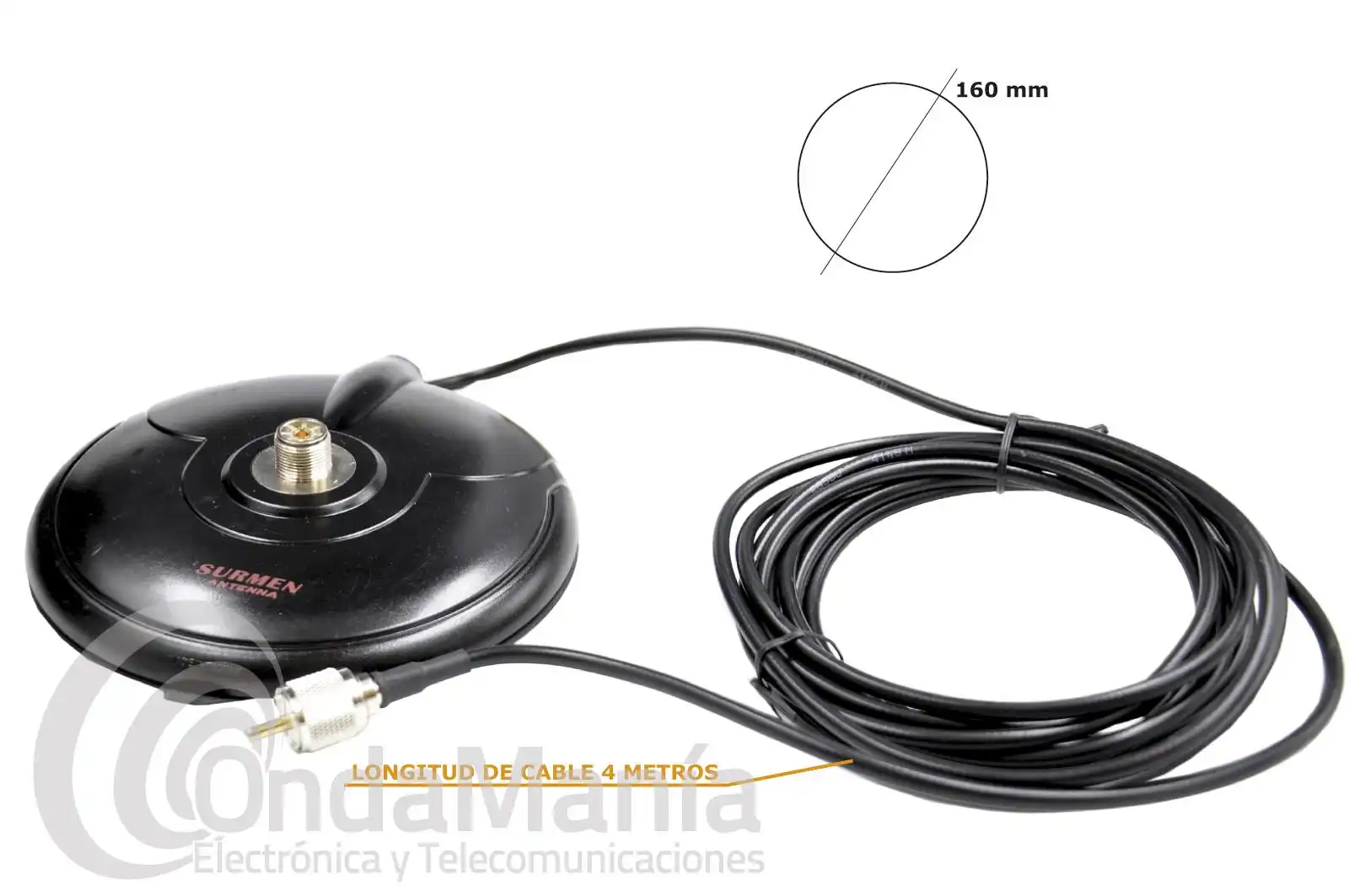 Base magnética con conector PL, tiene un diámetro de 160 mm y una longitud de cable de 4 mts aprox y en su extremo un conector tipo PL macho.