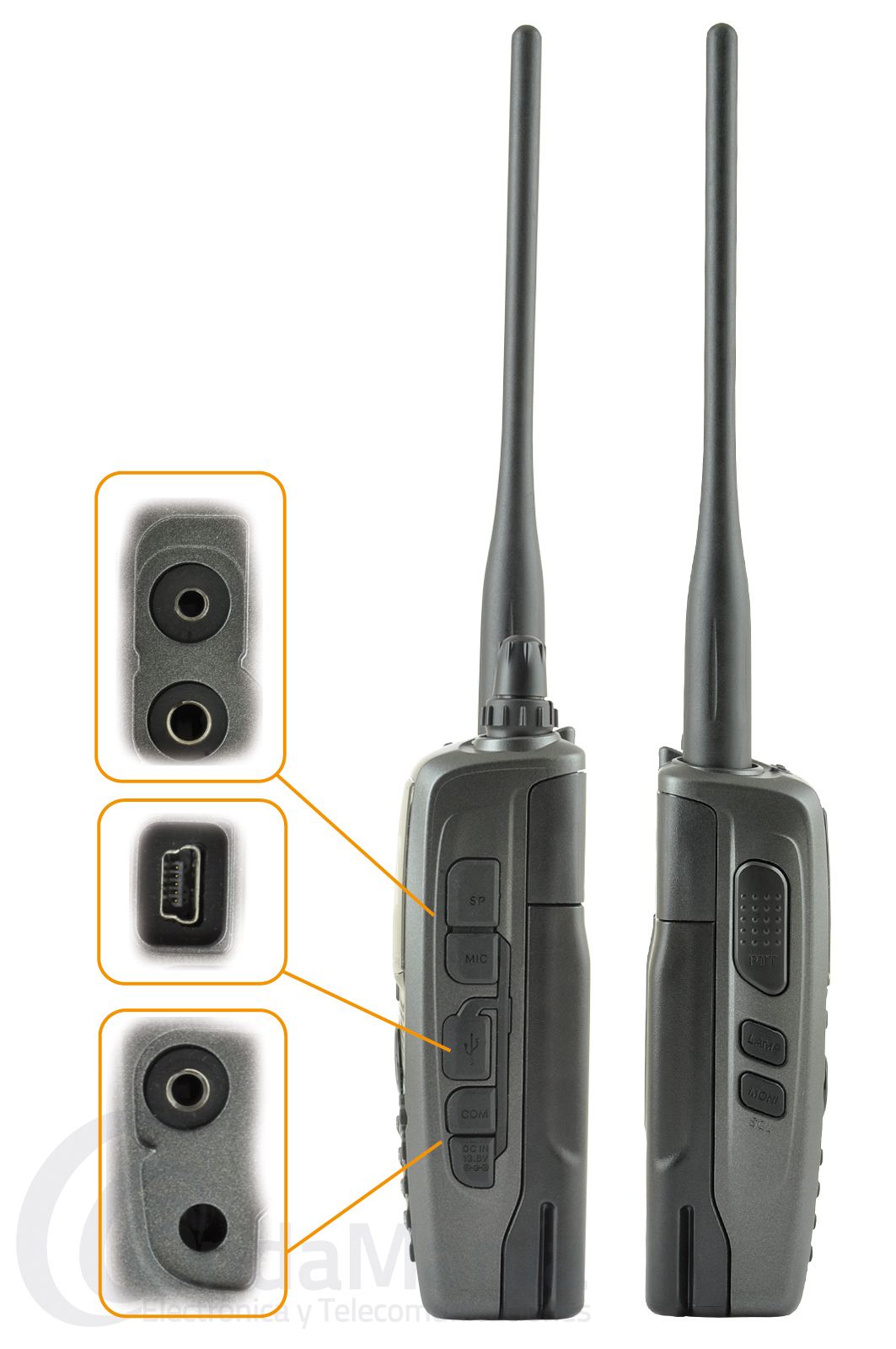 Gracias a las teclas de menú y flechas, seleccionar las diferentes funciones es intuitivo y fácil. Todas las teclas están retroiluminadas para facilitar su utilización en la oscuridad y el display LCD de matriz de puntos asegura unos iconos y textos claramente visibles. El botón rotativo de la parte superior del transceptor permite un ajuste del volumen y canal independiente.