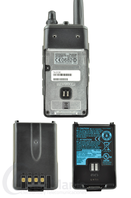 El TH-D72E se suministra con una batería recargablede iones de litio de 1800 mAh. Una carga puede alimentar el transceptor durante aproximadamente 6 horas de uso continuo a potencia de TX maxima de 5 Watt. La salidapuede ajustarse a HI (5W), LOW (0,5 W) o EL (0,05 W).