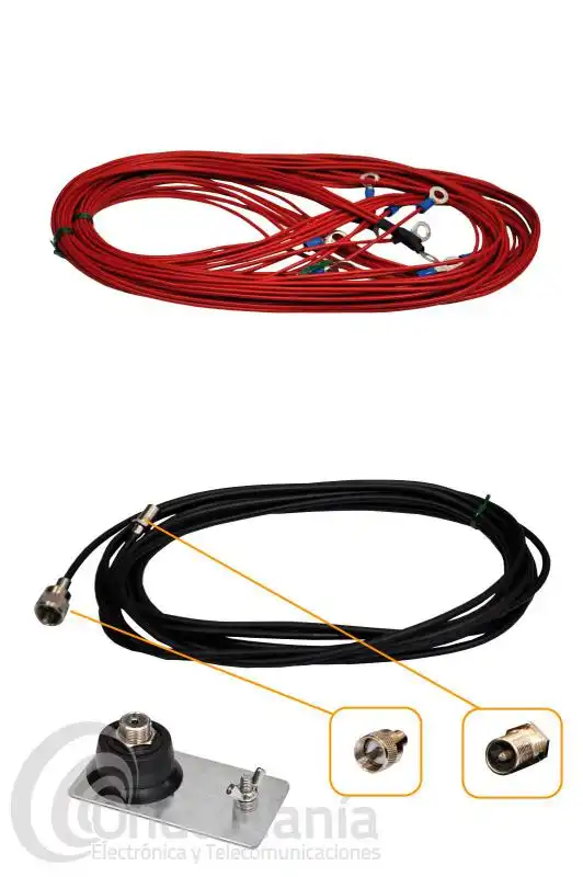 Trípode de viaje ultra compacto Komunica para QRP compuesto de mástil telescópico extensible con 5 secciones de aluminio, 1 pletina chapa de hierro galvanizado con base profesional SO-239 o PL, 2 Kit de toma de tierra no sintonizadas x 4 hilos de 3 metros preparados para fiación mediante piquetas, 1 latiguillo de 5,5 metros de cable RG-58 para conectar la base que esta en la pletina a la antena del equipo mediante un conector PL y tornilleria.