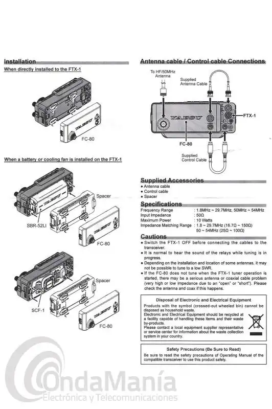 Exclusivamente fabricado y diseñado para el Yaesu FTX-1, el sintonizador automático de antena FC-80 responde a los comandos de control del transceptor FTX-1, proporcionando una coincidencia de impedancia basada en microprocesador en las bandas amateur de 160 a 6 metros. En consecuencia, no se debe esperar que el FC-80 coincida con antenas tipo " cable largo" a menos que se tomen medidas de diseño especificas para garantizar que la impedancia presentada al FC-80 esté dentro de estas especificaciones.