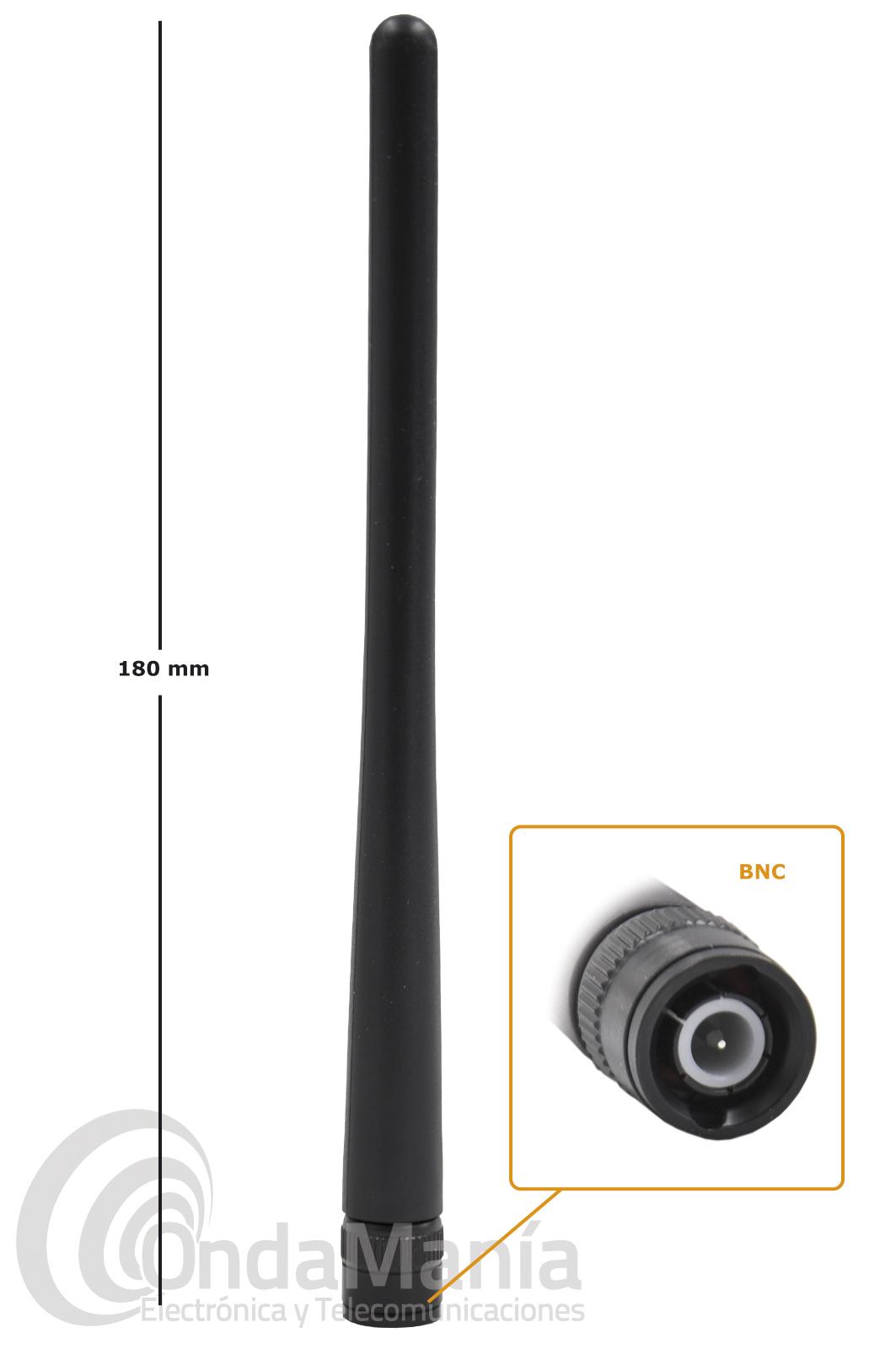 Antena de banda aérea Yaesu compatible con los walkie talkies Yaesu FTA-250, FTA-450, FTA-550, FTA-750, FTA-850,... o cualquier equipo de banda aérea que utilice conector de antena tipo BNC, con 180mm aprox. de longitud.